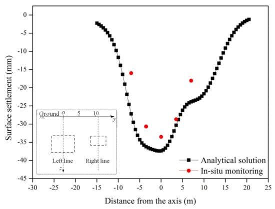 - A comparison of the numerical simulation and engineering case study showed that the proposed method can successfully predict ground surface settlement. In addition, this method can also take into account the asymmetry of the settlement curve caused by different construction sequences.