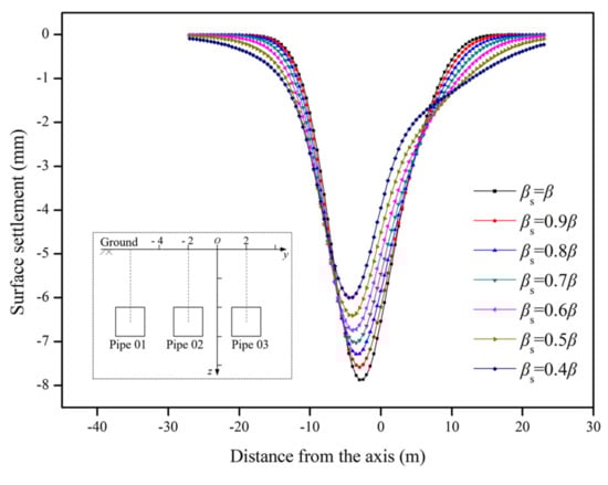 As shown in Figure 15, with the influence angle decreasing from β to 0.4β, the transverse surface settlement curve became wide and shallow, and the maximum settlement value gradually changed from 7.87 mm to 6.00 mm, a reduction by 23.76%. The maximum settlement point gradually moved to the negative direction of the y-axis (the completion area of pipe jacking construction), and the settlement value and influence range of the right region of the transverse surface settlement curve increased significantly. It can be seen from the variation curve of the maximum settlement value in Figure 16 that the maximum surface settlement value increased with the increase in βs/β, and the two parameters approximately showed a nonlinear positive correlation.