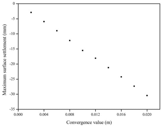 As shown in Figure 17, the surface settlement curve caused by pipe jacking construction basically conformed with a normal distribution. The maximum settlement was located at the position of x = −3 m. With the increase in the distance from the monitoring point to the two sides of the axis of the pipes, the settlement value gradually decreased and tended to be stable. In the process of the convergence values changing from 10 mm to 2 mm, the maximum value of the transverse surface settlement curve gradually changed from 15.50 mm to 2.88 mm, a decrease by 81.42%. It can be seen from the variation curve of the maximum settlement values in Figure 18 that the maximum settlement value of the surface increased with the increase in convergence values, and the two parameters approximately showed a linear positive correlation.