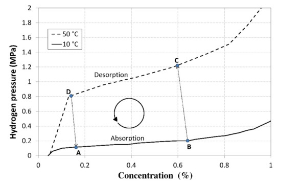 After the hydrogen desorption at higher pressures, the alloy was refrigerated back to the baseline temperature of 10 °C. In order to maintain the continuous operation of the compressor, two MH tanks were arranged in series and the heat was transported between them using a heat pump. The hydrogen absorption in the MH1 tank and the hydrogen desorption from the MH2 tank ran simultaneously (Figure 2). However, during the intervals when the temperature was changing, between points BC and DA, the hydrogen absorption did not take place in any of the tanks; that is why an additional tank was used (MH3) together with a compressor to absorb hydrogen while the operating temperatures of MH1 and MH2 tanks were changing. This facilitated a continuous hydrogen flow at the inlet into the compressor.