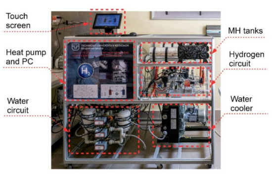 The measurement system also included 7 pressure sensors (5 sensors for H2 and 2 sensors for a coolant in the heat pump) with accuracy of 0.4% and 5 flow meters with accuracy of 1% (2 hydrogen mass flow rate meters and 3 heat-transfer fluid flow meters). At the outlets from I/O ports, there were 27 relays that facilitated controlling all the compressor devices (electronic valves, devices, coolers, etc.). Figure 4 shows the final arrangement of the components and Table 1 contains a description of the basic parameters of the MH compressor.