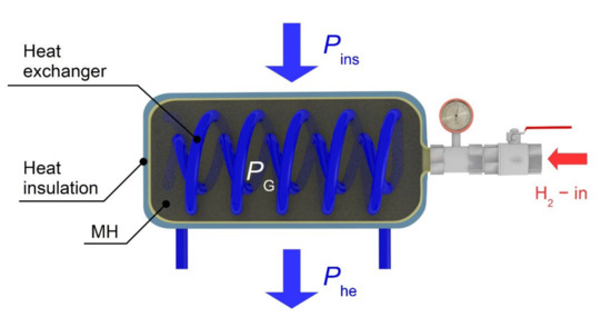 Equation (1) describes the amount of the heat removed during the isothermal hydrogen absorption into the metal alloy. If the real amount of the removed heat differs from the predefined value, the average temperature of the tank changes. The heating power generated during the hydrogen absorption PG, plus the heating power received from the surrounding environment through the insulation Pins, is removed by the heat exchanger Phe (Figure 5). If a difference between the cooling power of the heat exchanger and the supplied power (PG + Pins) is not zero, the tank temperature changes while respecting the calorimetric equation.