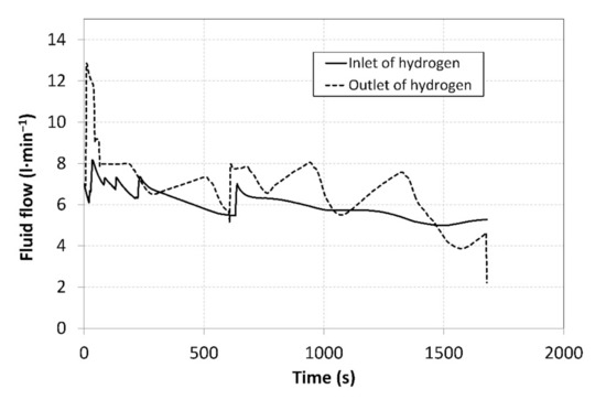The flow rates were regulated manually using thin dosing valves; that is why the curves exhibit significant degree of dispersion. By integrating the flow rates over time, the total volumes of the hydrogen that flew through the compressor inlet and outlet were identified (Figure 7).