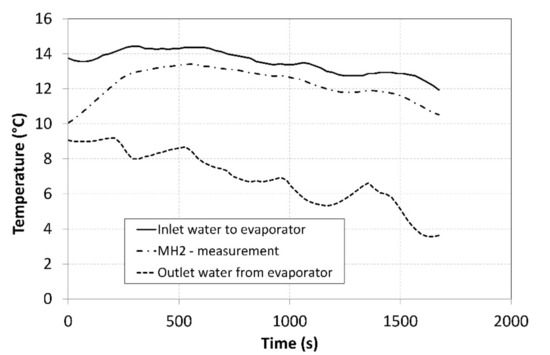 The pressure in the MH1 tank, from which the hydrogen was desorbed at a higher pressure, significantly depended on its temperature and it exhibited a descending curve as the hydrogen concentration gradually decreased. As the time passed, the pressure in the MH2 tank increased, and its value was much higher than the projected value of 0.2 MPa depicted in Figure 1. Such a development negatively affected the overall trend of the compression ratio. Figure 10 shows the curve of the temperature of the cooling fluid from the heat pump evaporator, which refrigerated the MH2 tank. Analogically, Figure 11 shows the curve of the fluid that heated the MH1 tank.