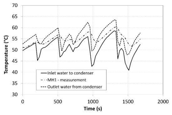 During the measurements, the average temperature of the MH1 tank, in which hydrogen desorption took place, amounted to 54.9 °C (Figure 8). The average temperature of the MH2 tank, in which the hydrogen was absorbed, was 12.3 °C. During the experiment, the absolute temperature shifted to the levels above the designed value; however, the difference between the temperatures in the tanks was 42.6 °C, whereas the designed value was 40 °C. Such a shift in the operating temperatures resulted in a shift in the operating pressures to the respective isothermal curves of the selected alloy. The average operating pressure in the MH1 tank was 1.08 MPa, while in the MH2 tank it was 0.56 MPa. As the hydrogen was gradually absorbed in the MH2 tank, the hydrogen concentration in the alloy was rising; consequently, the hydrogen pressure increased from the baseline value of 0.27 MPa to the final value of 0.58 MPa despite a minor change in the operating temperature. Similarly, the pressure in the MH2 tank decreased from the baseline value of 1.48 MPa to 0.81 MPa. If it is necessary to maintain a constant pressure at the outlet during the compression, the temperature in the tank must be gradually elevated.