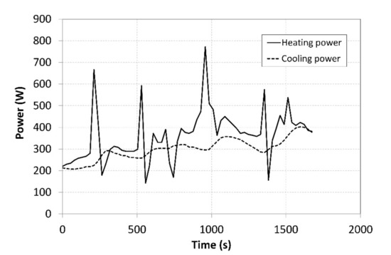 These curves were used to identify the instantaneous heating power and cooling power achieved in the heating and cooling processes while using the calorimetric equation (Figure 12). The volumetric flow rate of the heat-transfer fluid and the temperature difference between the inlet and outlet pipes were measured. The measurement uncertainty for the indirectly identified heating powers significantly depends on a current temperature difference and on the accuracy of the temperature sensor. It may be calculated using the following equation: