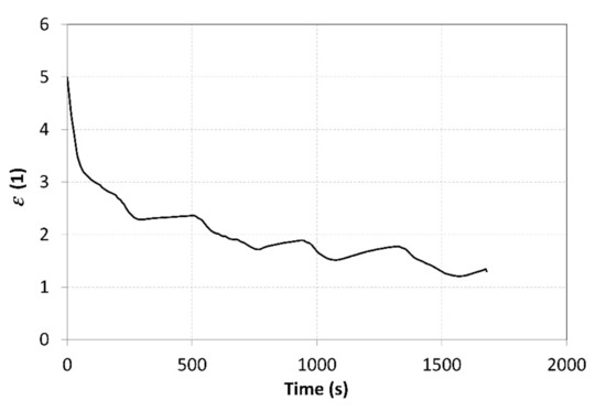 The measured values of the pressure in MH1 and MH2 tanks were used to calculate the average value of the compression ratio, which amounted to 2.5. The ε curve may be seen in Figure 13. The compression ratio was affected by a number of parameters, such as the hydrogen flow rates at the inlet and outlet, heat pump power, current amounts of hydrogen in the tanks, as well as the hydrogen pressure. Therefore, the value of the compression ratio was not constant during the measurements. The pressure at the outlet gradually decreased due to the regulation, which was aimed at achieving a constant temperature. This has also resulted in a decreasing compression ratio over time.