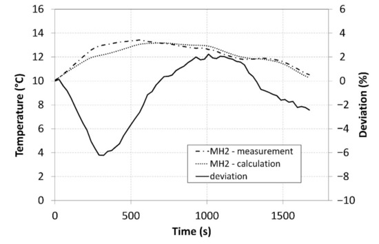 The analysis of the measured data, which were subsequently integrated in the model Described by Equation (12), facilitated calculating the values and plotting the curve of the temperature of the MH2 tank. Figure 14 shows a comparison of the measured surface temperatures of the tanks and the average temperature calculated while using the created model.