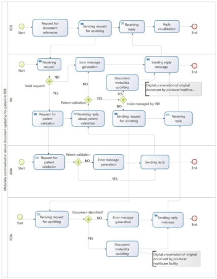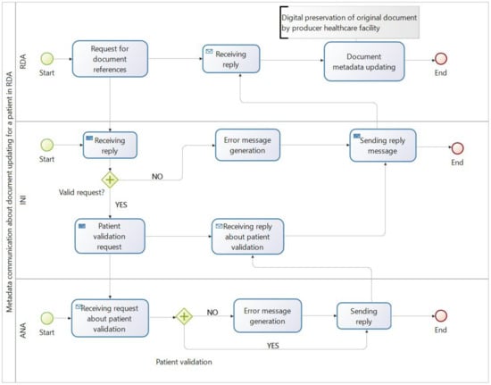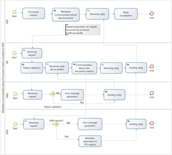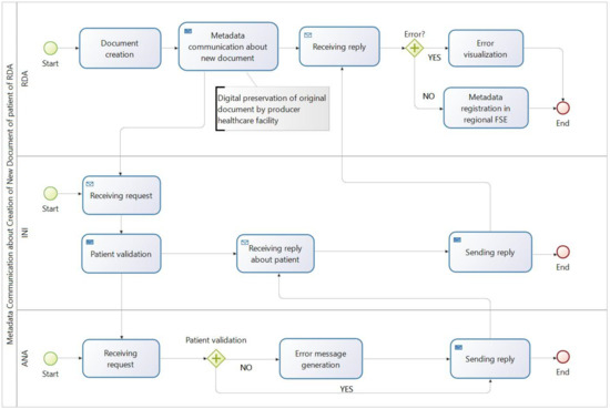 The main result of the present study coincides with the formalization of the efficient and enhanced use of the indexing and preservation metadata in the FSE registry, which allows for guaranteeing the correct document workflows and long-term access to reliable resources, even if different stakeholders are involved. The two proposed flows relate to the metadata communication: (i) in case of creation of a new document, and (ii) in case of metadata updating of an already indexed document. They can further differ depending on whether the document is about a patient in its RDA or in RDE. These flow charts, regarding the description and modeling of activities and related areas of expertise, are a simplified version of the metadata communication flows, which are part of the services offered by the INI [28].