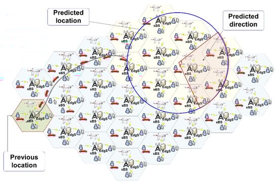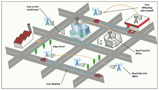 In MEC, 5G cellular users, intelligent sensors, surveillance systems, and other smart devices are connected to the network edge []. Handling mobile users at the network edge effectively uses spectral resources, lowers response time, and saves energy costs. By 2022, it is anticipated that global mobile data traffic would have increased by 77 exabytes per month []. 3D modelling, augmented reality, online gaming, high-definition multimedia processing, streaming, and machine learning-based applications are just a few examples of the computationally demanding applications that consume enormous amounts of resources and generate a large quantity of data []. In recent years, technological advances in multicore chip and memory architectures have made it possible for mobile devices to perform admirably. However, these mobile devices are still constrained with limited computational power, battery life, and memory. Edge computing overcomes these limitations by offering computational offloading [,]. In mobile edge networks, the intermediate servers between user and core network exist collocated at the small cell base stations that offer computation and storage services for the mobile devices. This service provisioning mechanism reduces the load on data centers with optimized response time []. Nevertheless, the issue of higher latency has been addressed to some extent, but some applications continue to have strict latency and computational limits [] and are offloaded to nearby MEC servers, as illustrated in Figure 1.