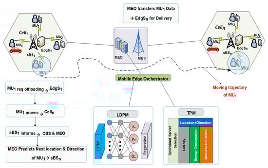 This section presents the proposed location and direction-aware task offloading framework based on LSTM. The proposed framework (COME-UP) consists of the Location and direction prediction model (LDPM) and task placement model (TPM). In order to forecast future location and direction of mobile users, the LDPM learns the mobile trajectories of mobile users from mobility traces and applies these learnings to predict their future location and direction, as explained in Section 4.1. Using features such as energy consumption, latency, and server utilization, the TPM chooses an optimum edge server residing in the expected cell locations, and then offloads the user tasks to the selected server, as described in Section 4.2. A mobile user MU1 positioned in cell1 delegates a task with higher computation requirements to the serving MEC server EdgS1. Nevertheless, due to frequent and quick mobility, the MU1 initiates a handoff to cell2 after submitting a job to the previously associated edge server, as shown in Figure 3.