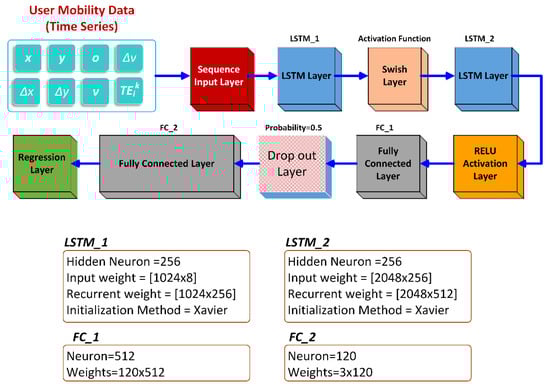 We propose LDPM as a method for predicting the location and direction of a mobile user. The user mobility characteristics in MEC networks are constrained, such as location, velocity, and direction, and the data set is nonlinear [,,]. Therefore, considering the nature of input data and the length of required parameters, time series analysis is applied to the mobile user trajectories. Recurrent neural networks (RNNs) offer higher prediction accuracy for time series problems []. Therefore, we employ a variant of RNN known as LSTM [] to predict the user location and direction using mobility traces, as shown in Figure 4.