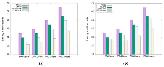 The latency values illustrated in Figure 5 are consistent with the acceptable delay requirements for the 5G network, which have been established in other studies []. The average latency of the proposed framework is noticeably lower than the other techniques in all cases of user distributions.