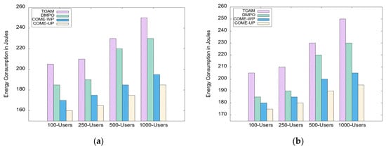 The COME-WP reduces latency by only predicting the user’s location. COME-UP anticipates user direction and selects the fastest server. The COME-UP fitness function prioritises server latency over other performance metrics such as energy and server utilization (see Figure 5a). With 100 users, TAOM automatically assigns tasks to the fastest server. When used with a large number of users, it does not scale well. DMPO has a lower task offloading latency than TAOM due to its simple server searching mechanism. Figure 5 shows how we measure latency by giving equal priority to the performance parameters. All of the techniques’ latency increased compared to the previous case. Since TOAM and DMPO lack the fitness function we proposed, their latency increases with user count. The energy consumption of COME-UP is lower than TAOM and DMPO but higher than its COME-WP variant in some cases. The server information contained by COME-UP is limited as it focuses on a particular area predicted by its LDPM model. As a result, there is a possibility that makes it hard to find an energy-efficient server there, especially when the numbers of users and servers are low. The energy consumption of the proposed techniques is lesser when the weight of energy is given higher priority during the server selection stage. However, no effect is observed in the case of TOAM and DMPO since they lack the proposed fitness function, as shown in Figure 6. The proposed framework outperforms existing methodologies and makes efficient use of available computational resources, as shown by the server usage results. TAOM has lower CPU utilization than DMPO, COME-UP, and COME-WP. Inefficient server selection causes high energy consumption and low CPU utilisation in the TAOM. Since the system’s workload grows with the number of users, the system’s total energy consumption grows as well. As a result, idle CPU energy is consumed positively, resulting in efficient resource usage (Figure 7). Also, when the server load was given more weight during optimal server selection, the resource utilisation of servers increased. The loss of the model is used to measure the performance of the model. The RMSE of the LSTM model-based proposed framework is calculated as 0.5321 that lies in an acceptable range for the training process, as shown in Figure A3.