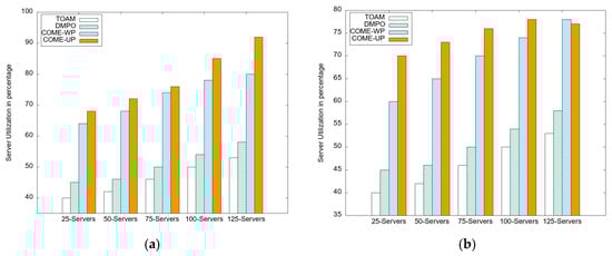 The higher number of mobile users has resulted in a significant increase in the energy consumed by edge servers. The illustration of the proposed model’s energy usage in comparison to that of the other models is shown in Figure 6. The CPUs draw the critical portion of the energy in edge servers []. We use the CPU utilization model for both energy estimation and server utilization. Figure 7 shows the server utilization with different server distributions.