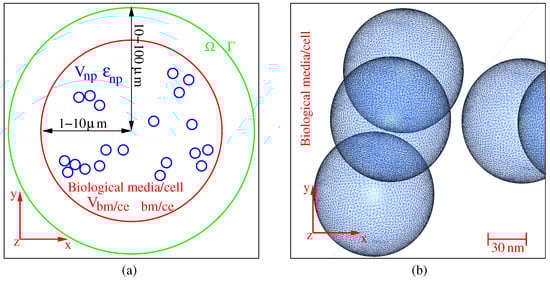 Equations (1) and (2) are solved through a 3D FEM with an adaptive remeshing process, ensuring the convergence of the numerical solution to a stable solution [18,19,20]. The remeshing process (see Appendix A.2) ensures the automatic and systematic control of the accuracy of computation in the multiscale domain (e.g., the typical size of the nanoparticles is small, between 10–100 nanometers, and that of the cell is 1–10 microns). Figure 1a shows a schematic of the referenced problem: agglomerates of individual gold nanoparticles (blue circles) on individual volume and permittivity , embedded in a volume of biological media with relative permittivity . The computations are achieved in a domain with boundary . Figure 1b shows an example of the mesh domain associated with such an agglomerate of nanoparticles.