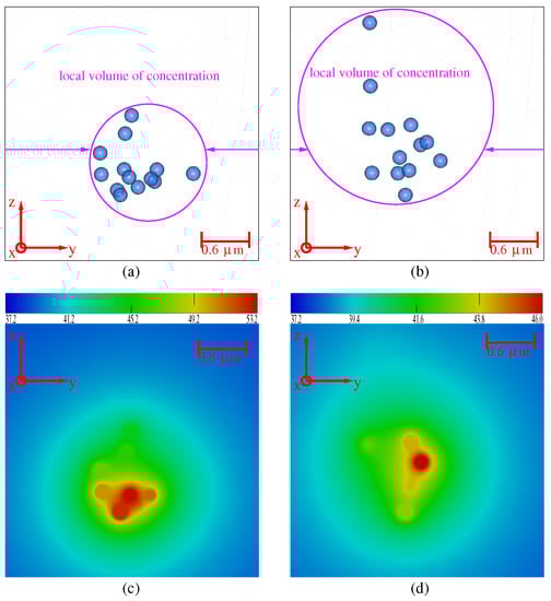 Agglomerates of nanoparticles (blue disks) for two relative mass concentrations, (a) (i.e., relative volumic concentration ) and (b) (i.e., relative volumic concentration ), and their respective temperature maps (c,d).