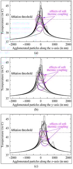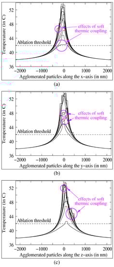 Figure 4a–c and Figure 5a–c show the temperature variations above the ablation threshold as a function of the extensions along the x-, y-, and z-axes for the two mixtures of agglomerates with and , respectively.