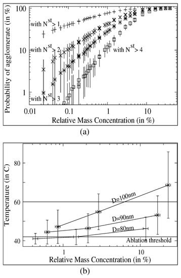 where is the integer part. With such and , a range of relative mass concentrations can be managed with a probability of succes. The probabilities of producing agglomerates are deduced from statistical analyses obtained from multiple relative mass concentrations and random generations of the spatial distributions of the agglomerates. We use 100 relative mass concentration values, varying in (0.02; 35.0)%, and for each value, 1000 random spatial distributions are produced for the agglomerates before solving the photo-thermic problem. With these random generations, statistical analysis of the -agglomerates permit assigning probabilities of producing -agglomerates and their uncertainties. Figure 6a shows the probability of producing an N-agglomerate as a function of the relative mass concentration for various strong couplings. As expected, for a given concentration, the larger the , the smaller the probability of producing such an -agglomerate. Such a probability increases with the relative mass concentration. Figure 6b gives the ranges of temperatures (minimum and maximum) as a function of the relative mass concentration for mixtures of agglomerates and for three diameters of nanoparticles. The larger the diameter of nanoparticles, the larger the range of temperatures and the higher the maximum temperature (that could overpass the maximum temperature limit).