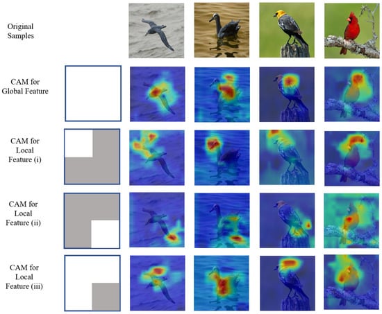 In order to explore the semantic difference among the local features, we conducted an experiment on the visualization of the CNN. During the network training, we multiplied the feature of the last layer of the network by different fixed binary masks, so that only part of the feature in the last layer of the network could participate in the network training. We used class activation maps (CAMs) [20] to visualize the trained model. Specifically, ResNet-50 [23] trained on CUB-200-2011 [25] was chosen as the baseline model. All the models were trained from scratch for 200 epochs with a batch size of 32, and the learning rate was decayed by a factor of 0.1 at Epochs 100 and 150. The choice of epochs and batch size followed the common practice. Training with a few epochs cannot guarantee network convergence, while training with too many epochs may lead to the overfitting of the network. Network convergence can be guaranteed without overfitting when training with 200 epochs. Theoretically, the larger the batch size, the better the network performance is. However, a large batch size will result in a large memory overhead. When the batch size was set to 32, we could obtain the best network performance under existing computing resources.