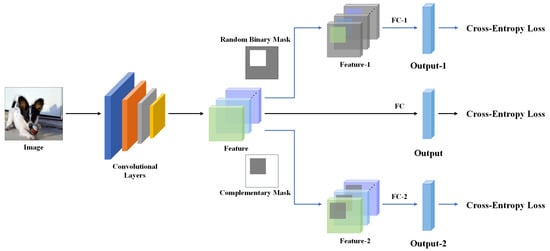 In order to make the network learn different local features, we first divided the high-dimensional feature into two complementary parts by using a binary mask. In the training phase, the training sample would be processed by the network, and we could obtain the feature X of this sample. After obtaining the complete feature before the last pooling layer, we generate a binary mask M with a bounding box with coordinates indicating the cropping regions on the binary mask. As CutMix [37], the box coordinates are uniformly sampled according to: