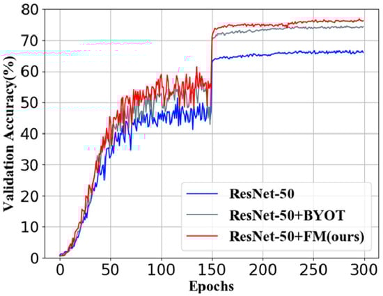 As shown in Table 6, we improved the accuracy of ResNet-50 from 66.73% to 76.26% (independent-samples t test, p-value = < 0.001), +9.53% with Feature Mining, which significantly surpassed previous self-distillation methods. It also shows that fully utilizing feature information has a high gain effect even on fine-grained image classification, which requires more subtle differences. Figure 3 shows the validation accuracy comparison among the baseline, BYOT, and Feature Mining on CUB-200-2011 with ResNet-50. The accuracy of BYOT and our method was much higher than the baseline, and the accuracy of Feature Mining was higher than that of BYOT.