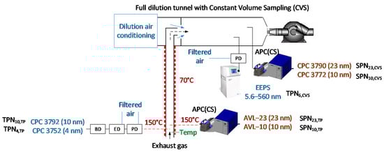 For the measurement of total particle number (TPN) concentration (i.e., solid and volatile particles), two systems were used: one at the dilution tunnel and the other at the tailpipe. The one at the dilution tunnel consisted of a porous diluter (PD) with a cold (i.e., not heated) dilution of approximately 10:1. The particle number concentration and size distribution were measured with an engine exhaust particle sizer (EEPS) from TSI. The covered size range was 5.6 nm to 560 nm. The second system at the tailpipe, based on the DownToTen project [], consisted of 0.8 m heated stainless-steel line at 150 °C, a porous diluter (PD) with dilution 10:1, an ejector diluter (ED) with dilution 10:1, and a bifurcated flow diluter (BD) with dilution 20:1. The filtered air of the PD and ED was not heated. The BD dilutes without the need of external air supply by splitting the flow: One part is filtered and used internally as dilution air. The reasons for having a third diluter and not a higher dilution at the first PD were twofold: Firstly, a primary dilution ratio of around 10–25:1 has been found to maximize the nucleation mode formation [,,]. Secondly, as we did not control the real-time dilution ratio by gas measurements (only with pressure measurements), the lower dilution ratio had lower uncertainty compared to a higher dilution. The system was characterized at the laboratory for particle losses and were found to be around 30% more in the 10 nm to 23 nm range and 50% more in the sub-10 nm range than the losses in the >23 nm range [,]. The particle number concentration was determined with two CPCs from TSI: one with 65% counting efficiency at 10 nm and the other 50% counting efficiency at 5 nm. The total particle number (TPN) emissions from these instruments will be abbreviated as: TPNx,y, where x is 4 nm, 6 nm (approximately the lower size detected by the EEPS), or 10 nm and y is a dilution tunnel (CVS) or tailpipe (TP).