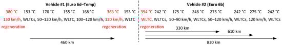 Schematic presentation of the test protocol. Temperatures are the maximum exhaust gas tailpipe temperatures of the specific tests. In red, tests where active regeneration took place. The 330 km and 610 km indicate the first and third test at 120 km/h which will be discussed in the Results section.