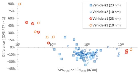 Figure 3 summarizes the differences between the SPN instruments connected at the tailpipe and the dilution tunnel for both >23 nm and >10 nm for both vehicles. The comparison is presented as the ratio of the SPN measured in the dilution tunnel (CVS) to the tailpipe (TP) measurement minus one. Thus, positive differences denote higher CVS measurements compared to TP, while negative differences denote the opposite. For emission levels > 5 × 109 #/km, the differences were −35% to 20%, with the instrument at the dilution tunnel measuring lower levels on average. The results are in good agreement with the literature, where differences of ±30% have been reported [,]. The differences can be attributed to uncertainties of the exhaust flow determination (5%) and agglomeration particle losses (10%) when the concentration is high (>107 #/cm3) (e.g., during cold start) []. The thermophoretic losses are negligible for exhaust gas temperatures up to 200 °C, as our tailpipe sampling was performed at 150 °C. They can reach 10% at exhaust gas temperatures close to 400 °C. High differences (20%) can also be seen when the particle size distributions peak at the cut-off size of the instrument (around 23 nm or 10 nm).