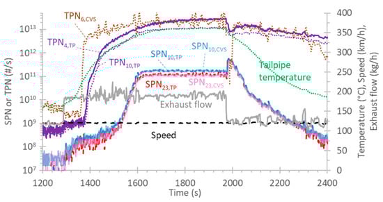 Figure 4 plots the emissions during the last regeneration event with the Euro 6d-Temp vehicle that took place during the 120 km/h constant speed driving. After more than 20 min at 120 km/h (at 1300 s), the regeneration initiated: The exhaust flow increased, and the tailpipe exhaust temperature started increasing slowly. The total particles started increasing at approximately 1400 s, somewhat earlier at the dilution tunnel (TPN6,CVS). The exhaust gas temperature at the tailpipe was around 200 °C when the total particles at the dilution tunnel started increasing sharply. The TPN6,CVS emissions at the dilution tunnel exceeded the levels of the 4 nm counter at the tailpipe (TPN4,TP). The emissions of the 4 nm counter were double than of the 10 nm counter (TPN10,TP) when TPN10,TP saturated, which suggests that the peak (mean size) of the nucleation mode was below 10 nm and closer to 4 nm.
