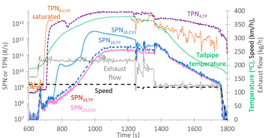 Figure 6b plots the particle number emissions. Only the solid particle number emissions > 10 nm at tailpipe (SPN10,TP) and dilution tunnel (SPN10,CVS) are given for the non-regenerating cycle for better clarity of the figure, and they are indistinguishable. The SPN10,TP of the regenerating and non-regenerating cycles were identical up to 1570 s; after that point, the SPN10,TP were higher for the regenerating cycle. The SPN23,TP were at the same level, without any evident existence of a solid core mode as with the Euro 6d-Temp vehicle. The >10 nm concentration from the dilution tunnel SPN10,CVS were at the same level as the SPN10,TP until approximately 1620 s; after that time, the SPN10,CVS clearly deviated. The total particle number (TPN) concentration started to increase from approximately 1600 s at the dilution tunnel, but the system at the tailpipe measured a significant increase after 1670 s. The SPN10,CVS followed the TPN signals, indicating that they could be volatile artefacts, even though the system had a catalytic stripper. Another fact that supports this assumption is that the SPN10,CVS was increasing when the SPN10,TP was decreasing, a behavior typical of volatile particles. The estimated mass from the EEPS was >10 mg/m3, which is at the same level with the mass of Figure 3, where such differences were also noticed.
