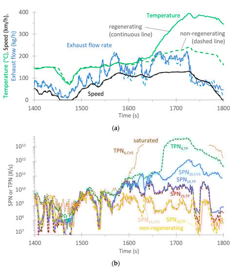 Figure 6 presents the regeneration of the Euro 6b vehicle at the last part of the WLTC. A non-regenerating WLTC is also plotted for comparison. Figure 6a shows that the speed and the exhaust flow rate were identical for the regenerating and non-regenerating WLTCs. The only difference was in the exhaust gas temperature at approximately 1600 s for the regenerating cycle.