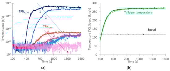 Three tests at 120 km/h at 330 km (1), 390 km (2), and 610 km (3): (a) Total particle number (TPN) emissions at the tailpipe (TP) or the dilution tunnel (CVS); (b) Speed and exhaust gas temperature at the tailpipe.
