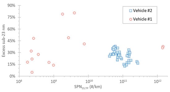 Figure 8 plots the excess sub-23 nm particles not counted with the current SPN procedure in the regulation, which considers only particles larger than 23 nm. Lowering the cut-off size to 10 nm would increase 10–40% the emissions for both vehicles in the concentration range of interest (>1010 #/km). At lower number concentrations in a few cases, higher percentages can be seen (the 80% values are from two WLTCs).
