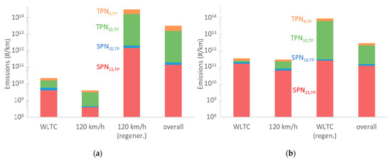 Solid particle number (SPN) emissions measured from the tailpipe (TP): (a) Vehicle #1 (Euro 6d-Temp); (b) Vehicle #2 (Euro 6b).