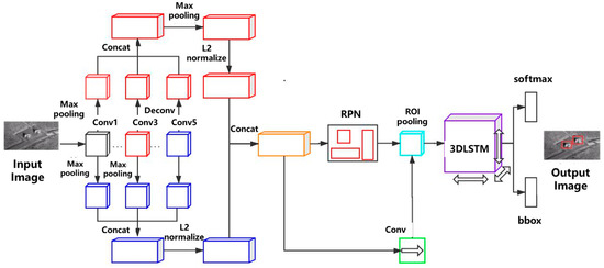 Target detection frameworks based on deep learning mainly fall into two categories: two-level detection framework and single-level detection framework [14]. The two-level detection framework includes a pre-processing step for region recommendations. That is, candidate regions are selected and then classified. Such representatives include Faster R-CNN and Mask R-CNN [15], etc. They adopt the R-CNN proposed by Girshick et al. [16] as the target suggestion method [17], which significantly reduces the amount of calculation compared with the traditional method. The conventional method usually uses superpixel, edge [18], and shape to score Windows, containing objects to generate region suggestion boxes. Deepbox [19] used a lightweight ConvNet model for training, which rearranged the regional suggestion boxes generated by the Edge box. Compared with R-CNN, these traditional methods often require a more extensive calculation. The single-stage detection framework adopts the regression method to directly regress the position and type of the target from the feature graph. The grid method or convolution of different scales is used to operate the feature graph to obtain the position and classification information of the target directly. Such representatives include YOLO and SSD. Generally speaking, the two-stage detection frame has higher accuracy, and the single-pole detection frame is faster. In order to improve the performance of CMF-3DLSTM, we use an infrared image target detection model based on multiscale feature fusion and context analysis proposed in this paper, and we adopt the target detection framework of Faster R-CNN as its basic framework.