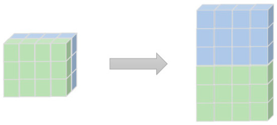 We fix the feature map’s length, width, and height separately and stretch the other two directions. In this way, the shape of the 3D feature map can be transformed into a 2D feature map. This two-bit information is then input into Bi-LSTM to extract contextual information along the fixed direction of the original feature map. Taking the length direction of the fixed feature map as an example, the 3D feature map becomes a 2D feature map (length, width × height) after transformation, and the specific transformation process is shown in Figure 7.