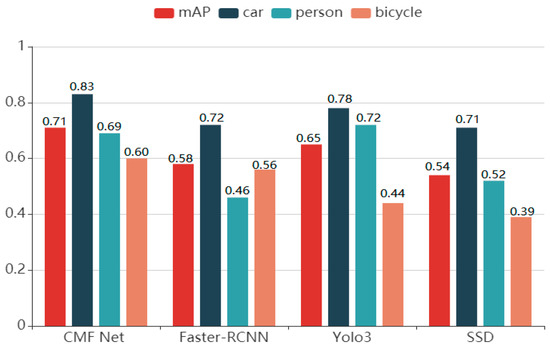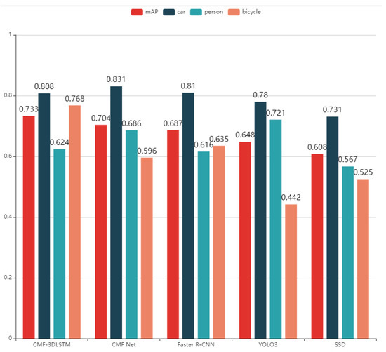 The experimental results are shown in Figure 11. The target detection model CMF-3DLSTM and other target detection models are evaluated on the test set of FLIR. Using the above methods, CMF-3DLSTM obtained about 73.3% mAP, while the mAP on CMF Net was about 70.4%, the mAP on Faster R-CNN was about 68.7%, the mAP on YOLO3 was approximately 64.8%, and the mAP on SSD was about 60.8%.
