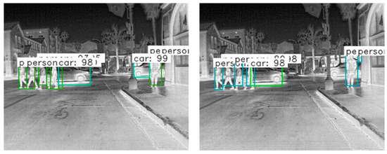 Although the CMF-3DLSTM model does not achieve optimal detection results for car, person, and bicycle alone, the average detection accuracy is more important in complex situations where multiple targets are nearby or even overlap or obscure each other. The target detection results of CMF-3DLSTM on the infrared image dataset FLIR are illustrated in Figure 12.