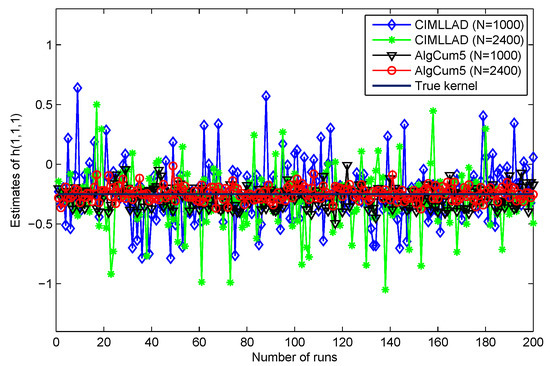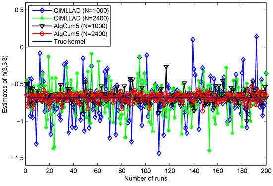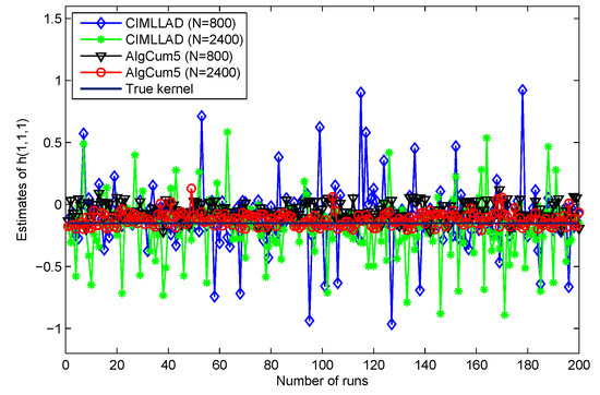 The simulation results of the estimated cubic kernels, mean and the standard deviations (Std. Dev.) of system I, over 200 Monte Carlo runs with non-Gaussian sample length input for various SNR are shown in Table 1. To analyze the convergence of this proposed blind approach to identify the nonlinear system I with high levels of noise (i.e., SNR = 0 dB), we represent the fluctuations around the means of the estimated nonlinear cubic kernels in Figure 2, Figure 3 and Figure 4, respectively. To illustrate this convergence and to test and validate it, these fluctuations are compared with those obtained using the adaptive algorithm such as CIM-LLAD (, , , , ) developed in [56]. The proposed blind method has lower fluctuations around the true values of the identifying cubic kernels when compared with the CIM-LLAD algorithm of [56].