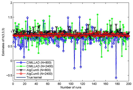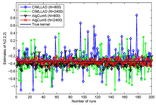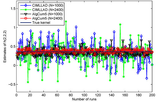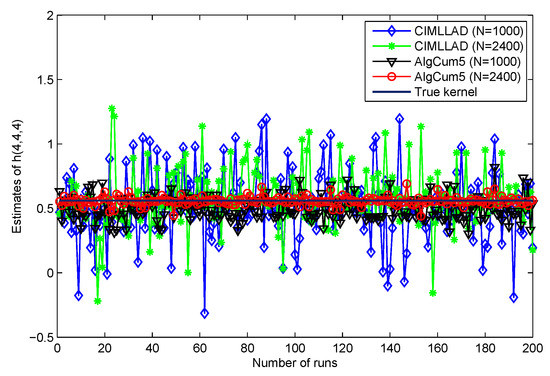 Figure 15 and Figure 16 concern the convergence of the proposed blind approach and the CIM-LLAD method, respectively. Figure 17 shows the differences between the true and estimated output signal using the proposed blind approach (AlgCum5) and the CIM-LLAD method. First, we identify the cubic kernels, then, we convolve it with the non-Gaussian input signal. We also computed the MSE, which is depicted in Table 2, once again, showing the clear advantages of the proposed blind approach.