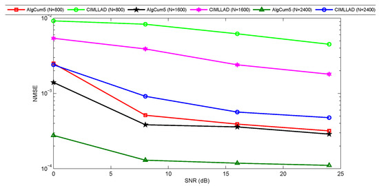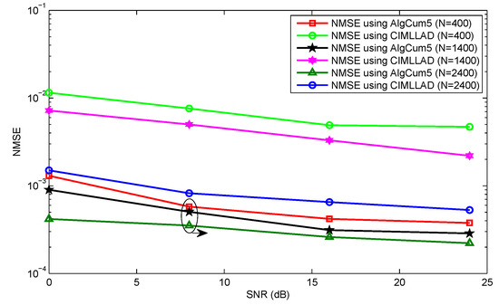 The advantages of the proposed method are even more clear when we look to the NMSE, especially for high noise levels (i.e., SNR = 0 dB). This is well supported by the existing literature as indicated above. Indeed, the additive Gaussian noise will almost vanish in the higher cumulants domain (superior to second-order) and the proposed approach, which uses fifth-order cumulants can achieve excellent identification kernels in very noisy environments compared to the CIM-LLAD algorithm. To illustrate the differences in the performance between the proposed and existing methods, we calculate the corresponding NMSE for various SNR and input signal sample sizes. The corresponding identification results are depicted in Figure 5.