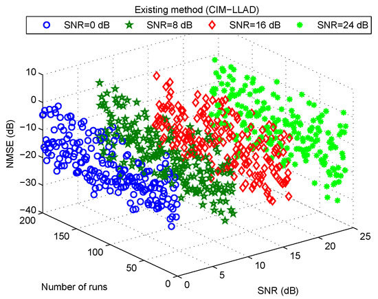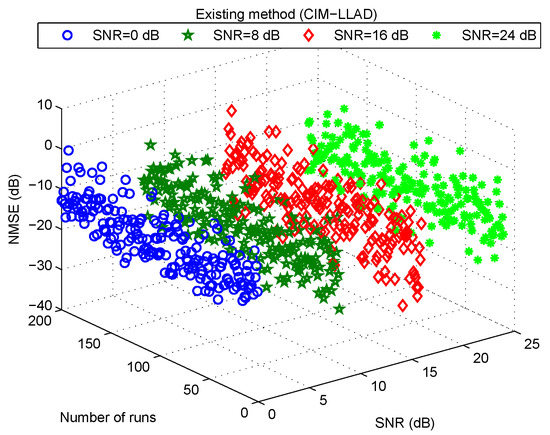 Behavior of the distributions of estimated NMSE using the existing method (CIM-LLAD) in system II.