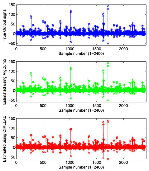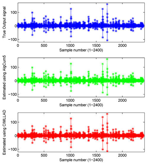 Figure 8 concerns the differences between the true and estimated output signal using the proposed blind approach (AlgCum5) and the CIM-LLAD method. We take MSE on the true and estimated outputs as criterion of comparison, i.e.,