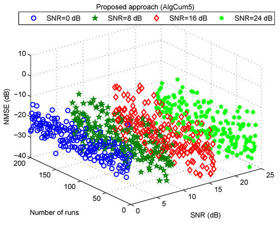 Behavior of the distributions of estimated NMSE using the proposed approach (AlgCum5) in system I.