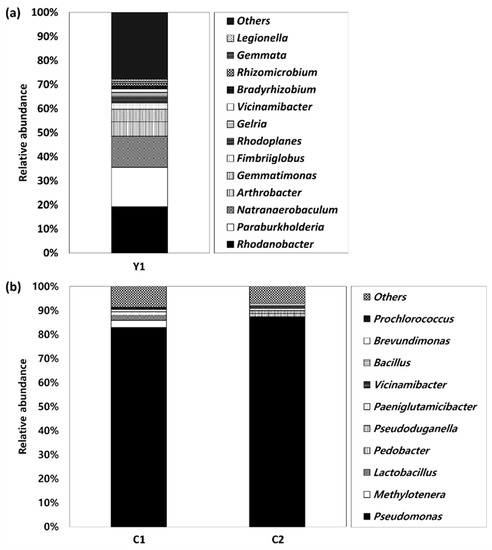 Microbial community structures at the genus level of bacterial consortia isolated from (a) Y1 soil sample and (b) C1 and C2 soil samples.
