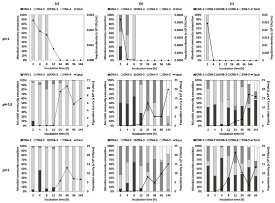 Distribution of the bacterial strains (bar type) and variation of population density (marked line graph) of the (a) Y1, (b) C1, and (c) C2 bacterial consortium with an incubation time of acidic neutralization process at an initial pH of 4, 4.5, and 5, respectively.