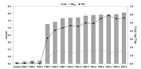 Comparison of the acid neutralization properties of the final pH (bar graph), OD600 (dashed line), and normalized concentration of ammonium ion (NH4+) (solid line) for single bacterial strains after 48 h of the acid-neutralization test. Control was an acidified medium without bacterial inoculation.