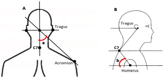 Marker placement and postural angles. (A) Hunched shoulder posture; (a) hunched shoulder angle; (B) rounded shoulder posture; (b) rounded shoulder angle.
