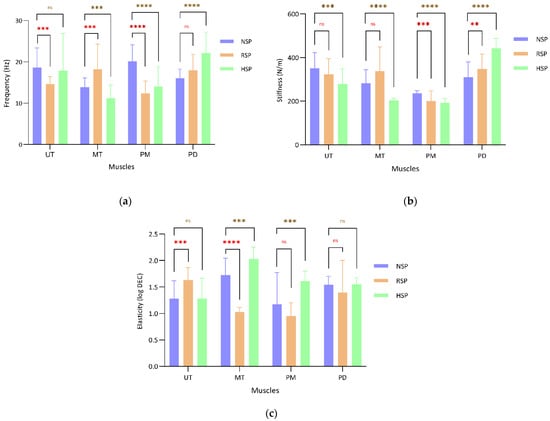 Mechanical parameters of muscles: (a) tone; (b) stiffness; (c) elasticity of muscles; ns—not significant; ** ≤0.05, *** ≤0.01, and **** ≤0.001—statistically significant.